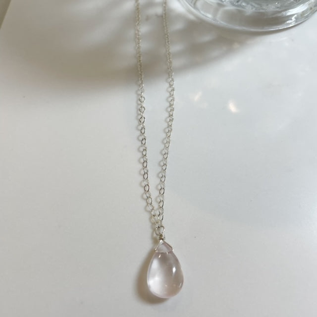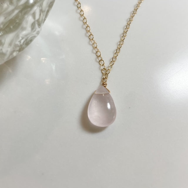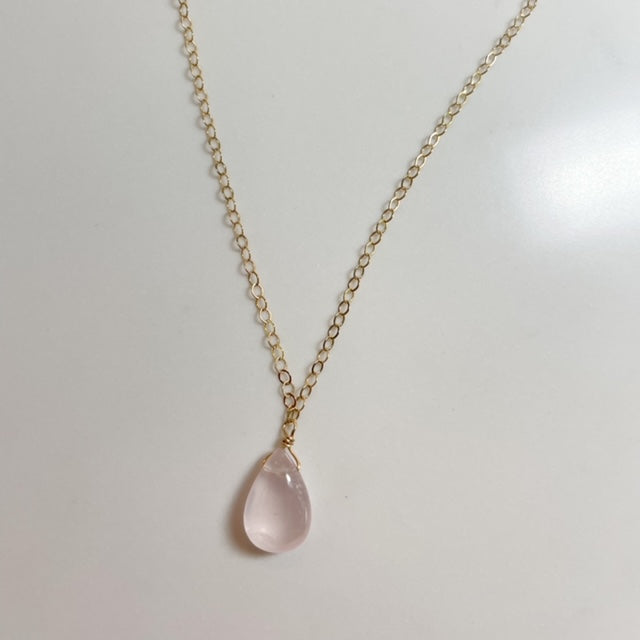 A delicate fine chain layering necklace with a Rose Quartz teardrop pendant and adjustable drop chain. Available in 14K gold fill or sterling silver.