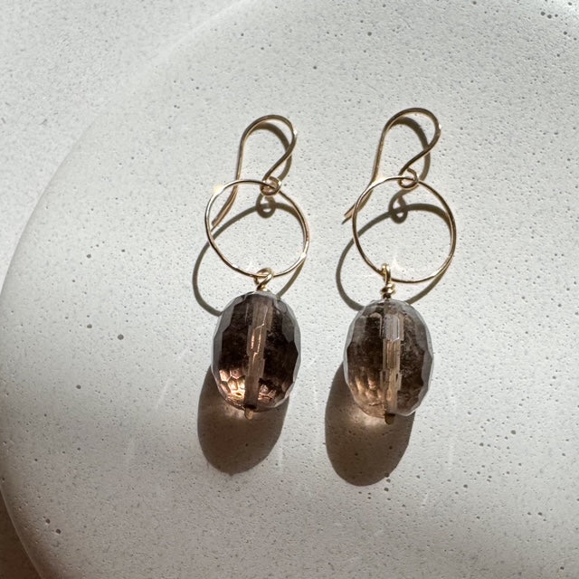 Sophisticated and striking with a rich, earthy glow. These handmade earrings feature a faceted 13mm x 18mm smoky quartz barrel suspended from a hand-formed circle. Each pair measures 2.5" long (3" including the ear wire) and offers a graceful balance of movement and depth—available in 14k gold fill or sterling silver.