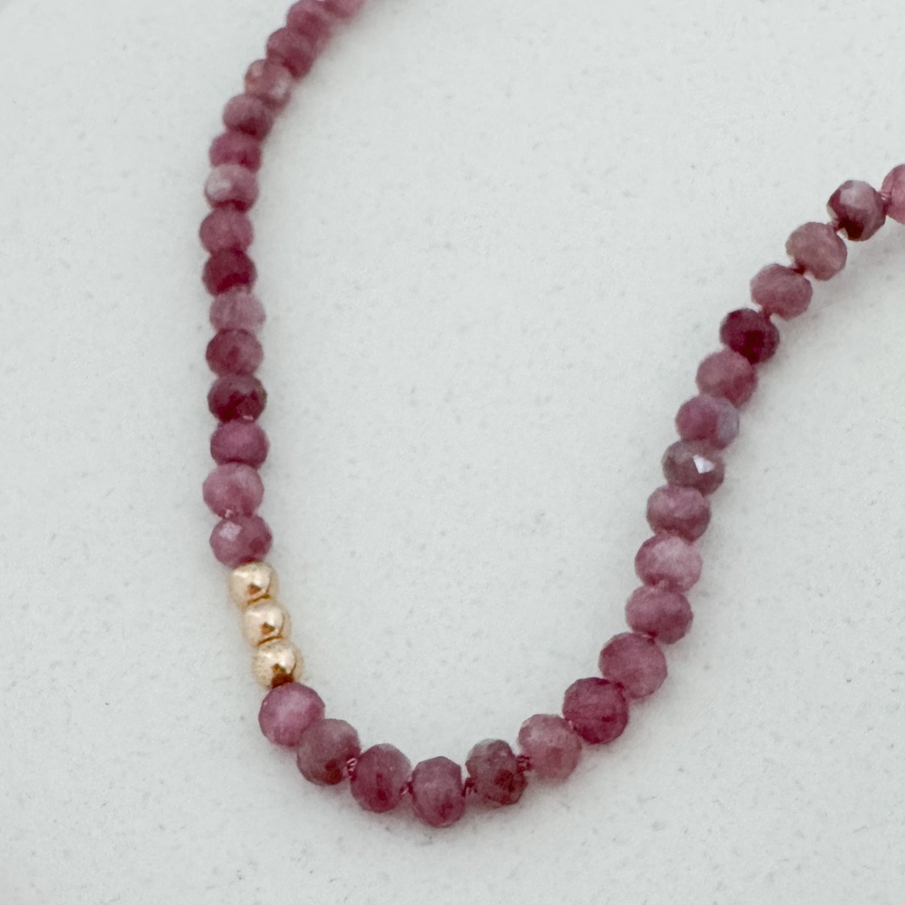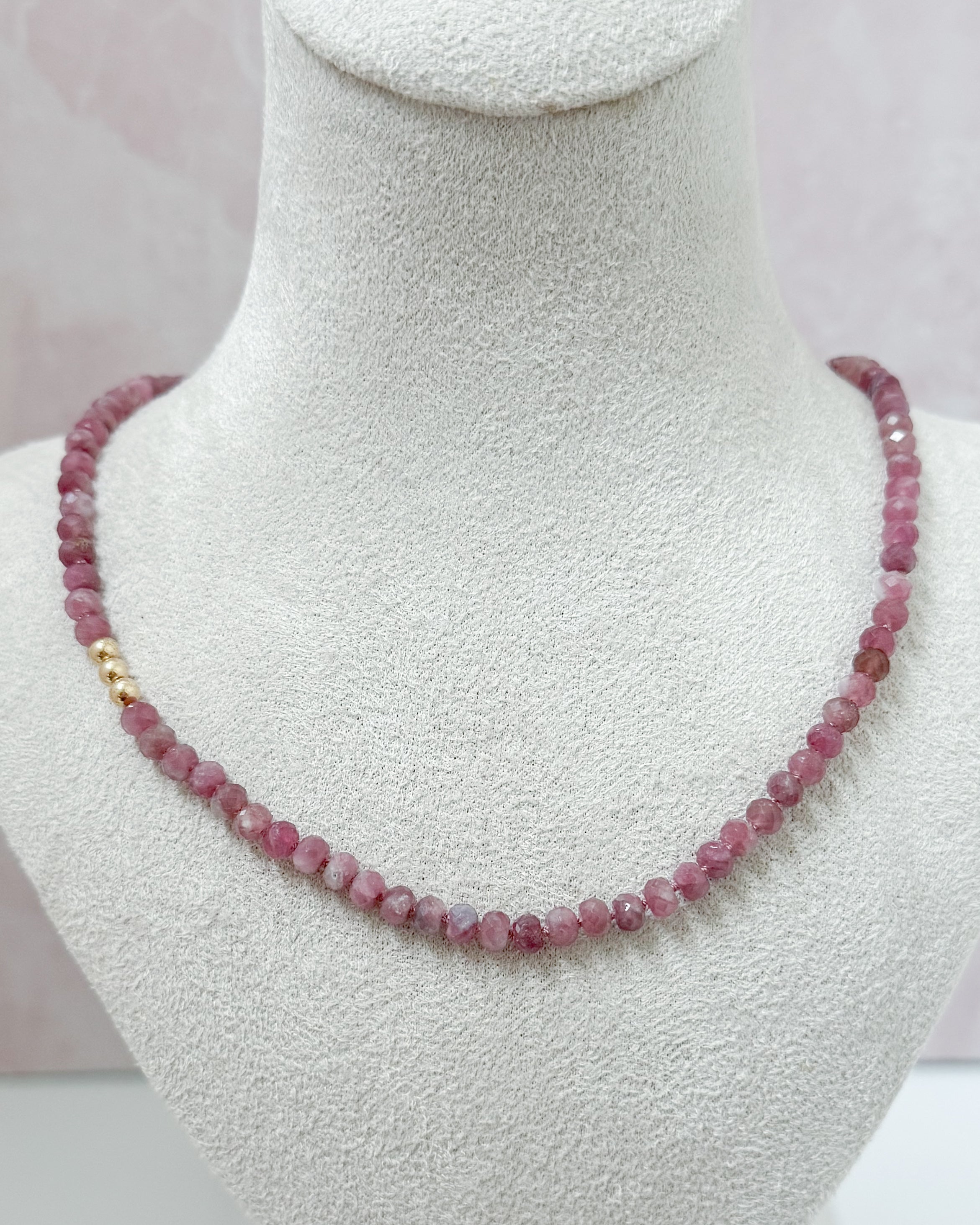 This necklace features 4×6mm faceted pink tourmaline rondelles, each hand-knotted on silk for a soft, flexible drape. Designed at 16" with a 2" extender, it sits comfortably at the collarbone with a hint of color and subtle sparkle. Finished in your choice of sterling silver or 14k gold fill.
